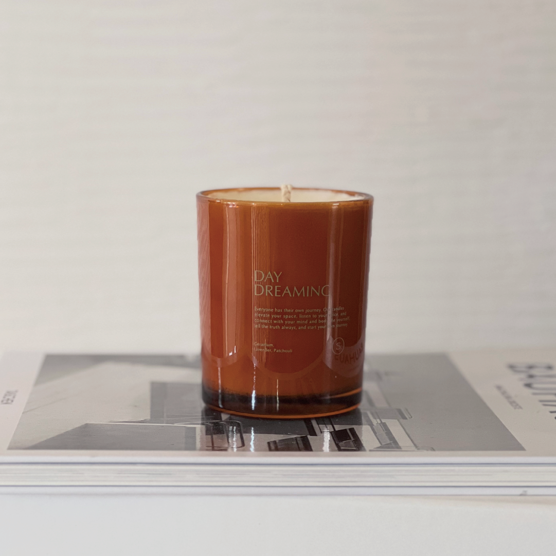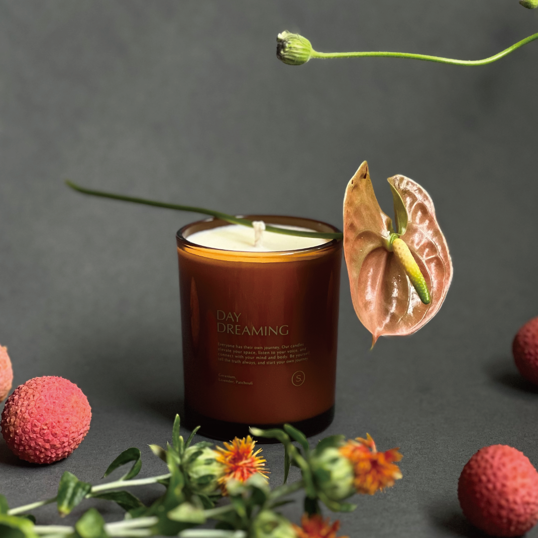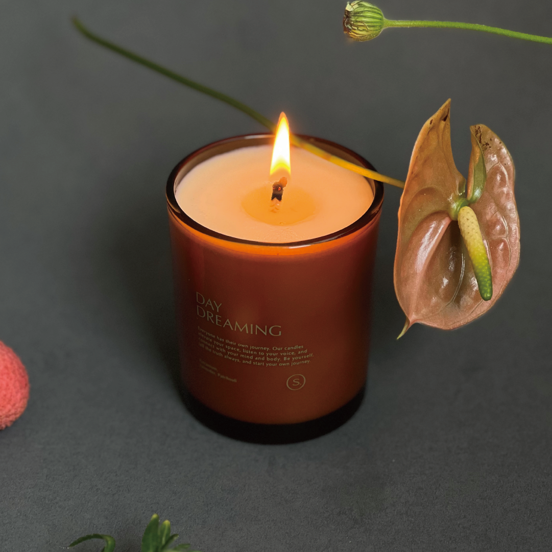 キャンドルワックスには大豆から作られたソイワックスを使用し、キャンドル芯には100%コットン芯を使用しております。また香りづけはすべて植物由来の100%エッセンシャルオイル(精油)を使用しておりますので、自然に柔らかく香るのが特徴で、お食事中も問題なく灯していただけます。